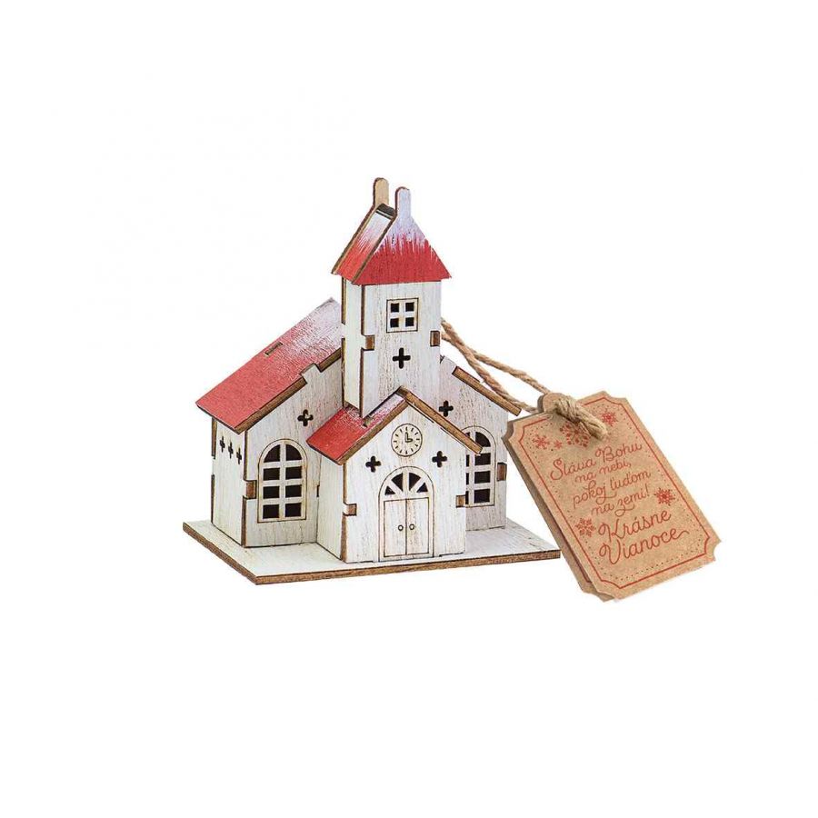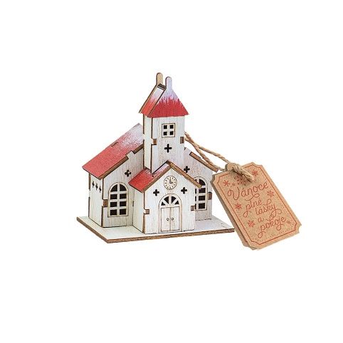 Vánoční dekorace - děvěný kostelík s LED světlem doplněný ozdobným přívěškem s textem. Vhodný i jako vánoční dárek. Baterie je součástí kostelíku.