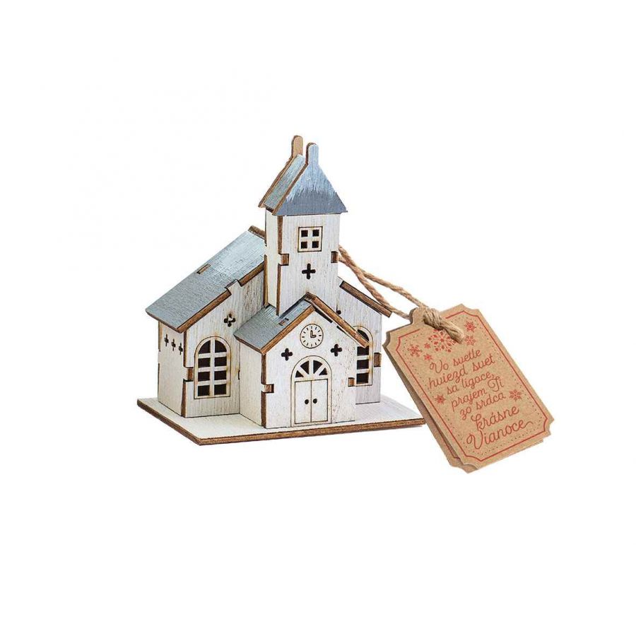 Vánoční dekorace - děvěný kostelík s LED světlem doplněný ozdobným přívěškem s textem. Vhodný i jako vánoční dárek. Baterie je součástí kostelíku.