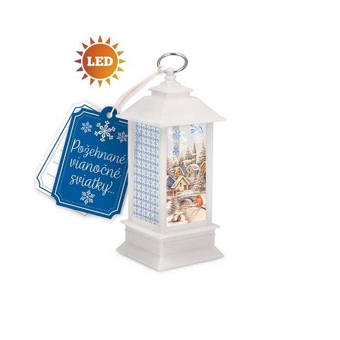 Vánoční dekorace - lucerna s LED světlem a potiskem, doplněná ozdobným přívěškem s textem v imitaci dřeva. Vhodná i jako vánoční dárek. Baterie je součástí lucerny.