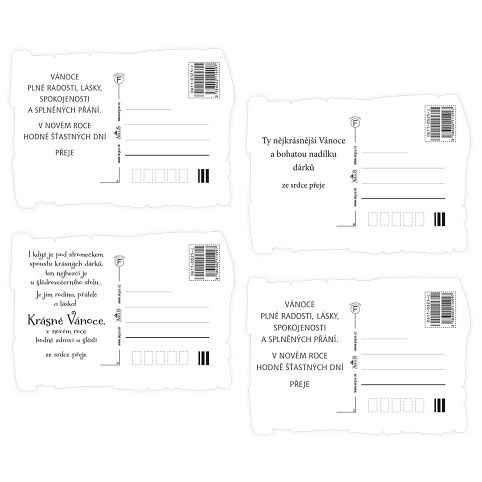 Vánoční pohlednice s textem na zadní straně. * originální technologie zpracování od společnosti ARGUS - "Na detailu záleží!"* POZOR!!!: Cena uvedená na eshopu je za 1 ks pohlednice. Motiv si není možné vybrat - zasíláme dle dostupnosti skladu. Je však možné do poznámky k objednávce uvést, o který motiv máte zájem, v případě jeho dostupnosti Vám bude tento zaslán. Pokud je objednáno 2 a více kusů - posíláme mix pohlednic