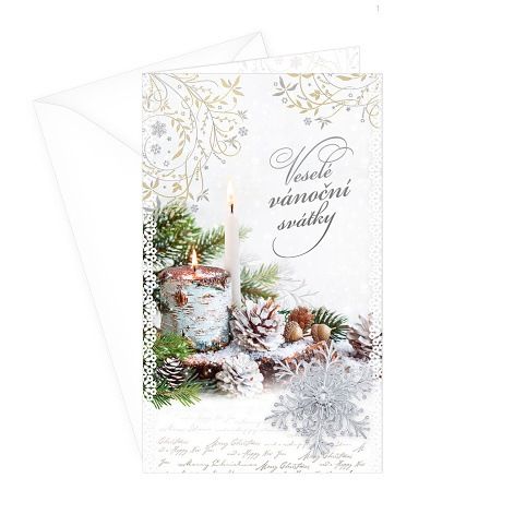 Vánoční přání, technologie zpracování razba. Text uvnitř přání: "Ať stromeček krásně voní, ať zvoneček na Štědrý den zvoní, ať pocit štěstí a lásky hřeje, ty nejkrásnější Vánoce přeje". Součástí vánočního přání je také barevně sladěná obálka. Originální technologie zpracování od společnosti ARGUS - "Na detaile záleží!"