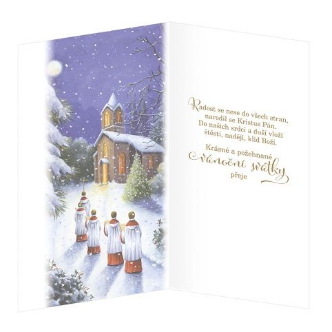Vánoční přání - náboženské. Technologie zpracování ražba se slepotiskem a reliéfní ražba. Text uvnitř přání: Radost se nese do všech stran, narodil se Kristus Pán. Do našich srdcí a duší vloží štěstí, naději, klid Boží. Krásné svátky přeje Součástí balení vánočního přání je i barevně sladěna obálka. Originální technologie zpracování od společnosti ARGUS - "Na detaile záleží!"