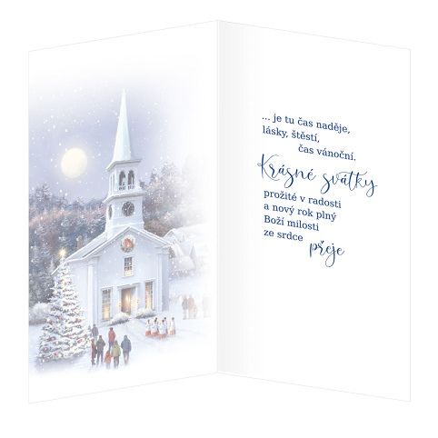 Vánoční přání. Technologie zpracování ražba, termografie a lepený komponent - postavičky se stromečkem. Text uvnitř přání: ... je tu čas naděje, lásky, štěstí, čas vánoční. Krásné svátky prožité v radosti a nový rok plný Boží milosti ze srdce přeje..... Součástí balení vánočního přání je i barevně sladěna obálka. Originální technologie zpracování od společnosti ARGUS - "Na detaile záleží!"