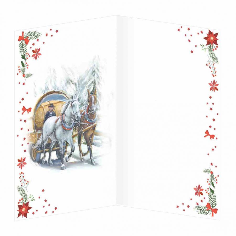 Vánoční přání. Technologie zpracování slepotisk, termografie, ražba a lepený komponent - koně. Bez vnitřního textu, balení obsahuje inspirační texty. Součástí balení vánočního přání je i barevně sladěna obálka. Originální technologie zpracování od společnosti ARGUS - "Na detaile záleží!"