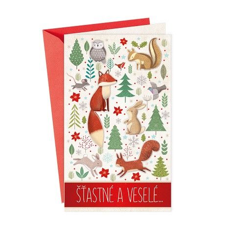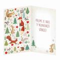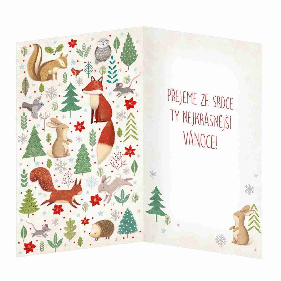 Vánoční přání. Technologie zpracování ražba, termografie a lepený komponent - zvířátka. Text uvnitř přání: Přejeme ze srdce, ty nejkrásnější Vánoce! Součástí balení vánočního přání je i barevně sladěna obálka. Originální technologie zpracování od společnosti ARGUS - "Na detaile záleží!"