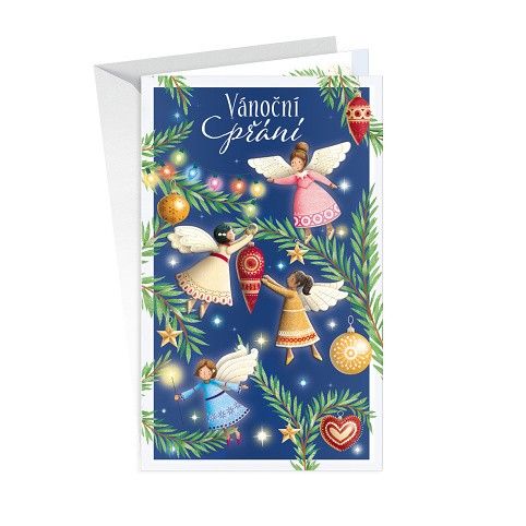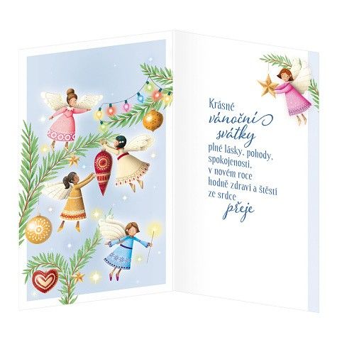 Vánoční přání. Technologie zpracování 2x termografie, výsek a lepený komponent - andělé. Text uvnitř přání: Krásné vánoční svátky plné lásky, pohody, spokojenosti v novém roce hodně zdraví a štěstí ze srdce přeje. Součástí balení vánočního přání je i barevně sladěna obálka. Originální technologie zpracování od společnosti ARGUS - "Na detaile záleží!"