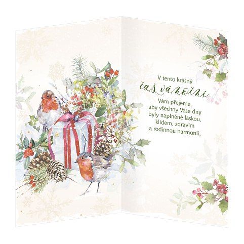 Vánoční přání. Technologie zpracování termografie, slepotisk a mašlička jako komponent. Text uvnitř přání: V tento krásný čas vánoční Vám přejeme, aby všechny Vaše dny byly naplněné láskou, klidem, zdravím a rodinnou harmonií. Součástí balení vánočního přání je i barevně sladěna obálka. Originální technologie zpracování od společnosti ARGUS - "Na detaile záleží!"