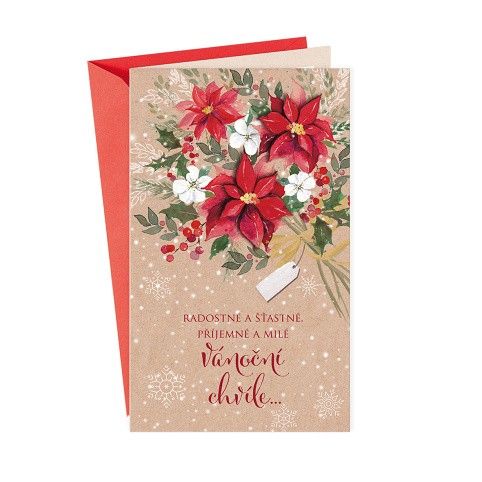 Vánoční přání. Technologie zpracování ražba, slepotisk. Text uvnitř přání: … do nového roku hodně zdraví, štěstí, spokojených a úspěšných dní ze srdce přeje Součástí balení vánočního přání je i barevně sladěna obálka. Originální technologie zpracování od společnosti ARGUS - "Na detaile záleží!"