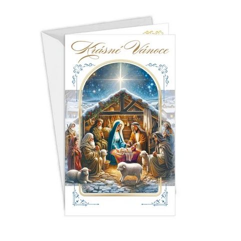Vánoční přání s náboženskou tématikou. Design je obohacený o lepený komponent. Text uvnitř pozdravu. Součástí vánočního přání je i barevně sladěná obálka. Originální technologie zpracování od společnosti ARGUS - "Na detaile záleží!"