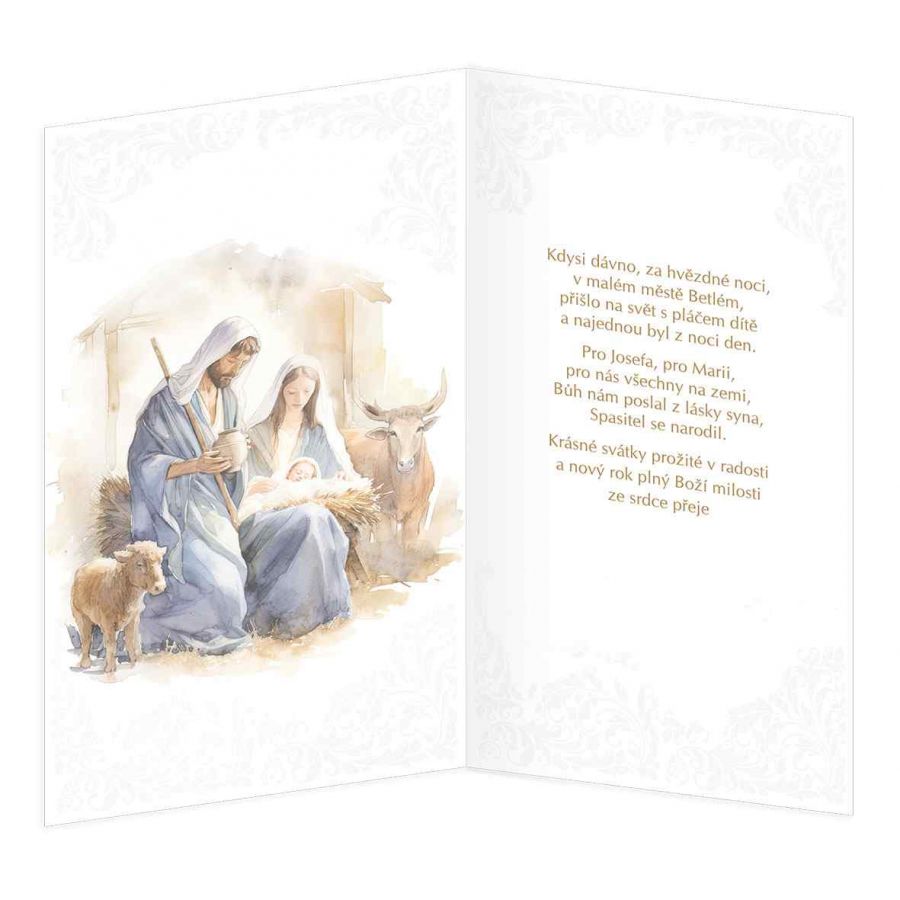 Vánoční přání náboženský s textem uvnitř přání. Design je obohacený o lepený komponent. Součástí přání je i barevně sladěna obálka. Originální technologie zpracování od společnosti ARGUS - "Na detaile záleží!"