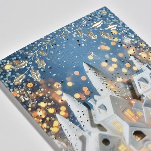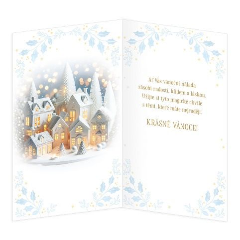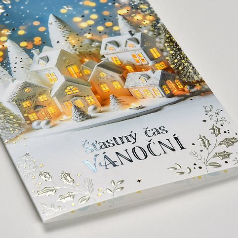 Vánoční přání s textem uvnitř přáníčka a lepeným komponentem domečků na přání vystupujících do prostoru.* součástí blahopřání je i barevně sladěna obálka* originální technologie zpracování od společnosti ARGUS - "Na detaile záleží!"