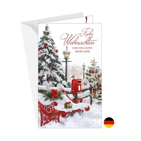 Vánoční přání s německým textem. Bez textu uvnitř. Součástí přání je i barevně sladěna obálka. Originální technologie zpracování od společnosti ARGUS - "Na detaile záleží!"