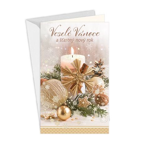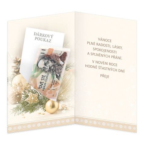Vánoční přání s klopou na peníze. Text uvnitř blahopřání. Součástí balení vánočního pozdravu je také barevně sladěná obálka. Originální technologie zpracování na blahopřání od společnosti ARGUS - "Na detailu záleží!"