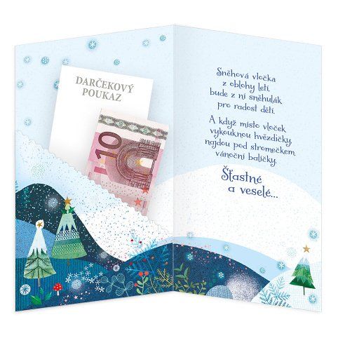 Vánoční přání s kapsi na peníze. Text uvnitř blahopřání. Součástí balení vánočního pozdravu je také barevně sladěná obálka. Originální technologie zpracování od společnosti ARGUS - "Na detailu záleží!"