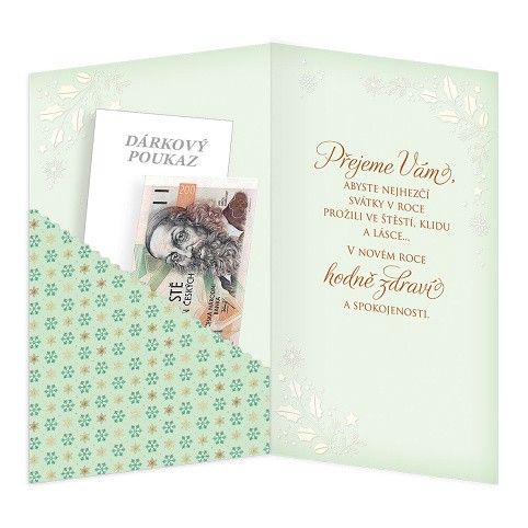 Vánoční přání s kapsi na peníze.* text uvnitř blahopřání* součástí balení vánočního pozdravu je také barevně sladěná obálka* originální technologie zpracování od společnosti ARGUS - "Na detailu záleží!"