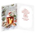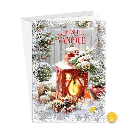 Vánoční pozdrav svítící s textem uvnitř přání.* po stisknutí tlačítka se rozsvítí LED světlo a rozosvítí vánoční lucerna na kartě* součástí vánočního pozdravu je barevně sladěná obálka* originální technologie zpracování od společnosti ARGUS - "Na detailu záleží!"