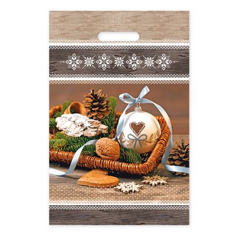 Vánoční igelitová taška je velmi jednoduchým a praktickým společníkem v období vánočních svátků. Celoplošně potištěná s vyseknutým uchem a rozšířeným dnem. Materiál LDPE.