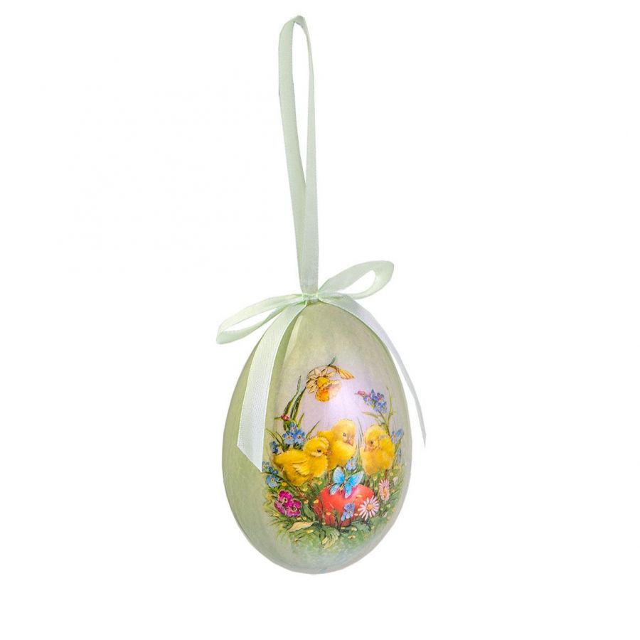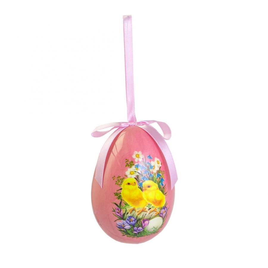 Velikonoční dekorace - vajíčko s jarním velikonočním motivem ve 4 barvách. Každá kraslice má sametovou stužku na zavěšení. Cena uvedena za balení.