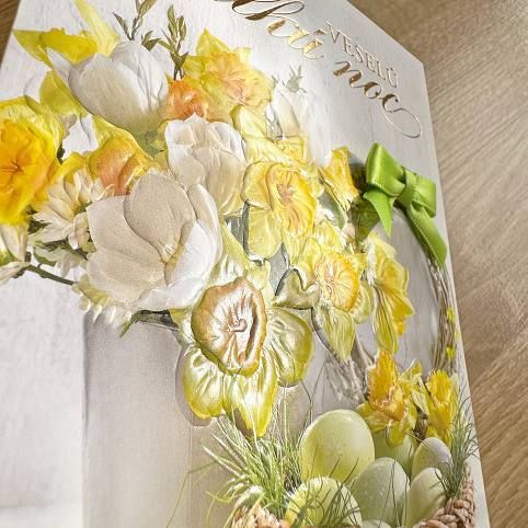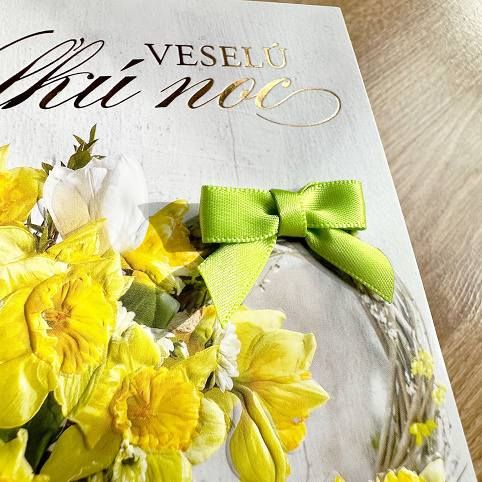 Velikonoční přání s lepeným komponentem bez textu uvnitř. Jeho součástí je barevně sladěna obálka. Originální technologie zpracování od společnosti ARGUS - "Na detailu záleží!"