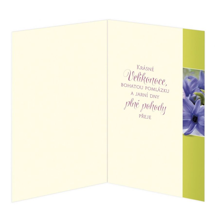 Velikonoční přání s textem uvnitř. Jeho součástí je barevně sladěna obálka. Originální technologie zpracování od společnosti ARGUS - "Na detailu záleží!"