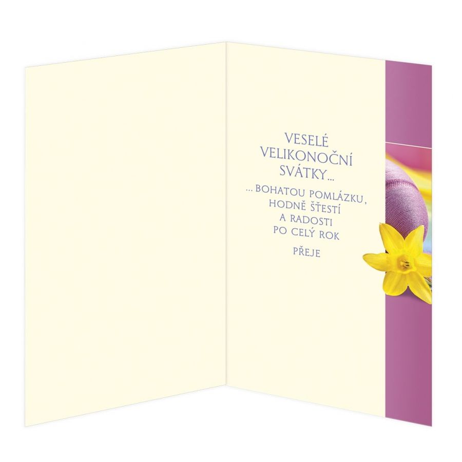 Velikonoční přání s textem uvnitř. Jeho součástí je barevně sladěna obálka. Originální technologie zpracování od společnosti ARGUS - "Na detailu záleží!"