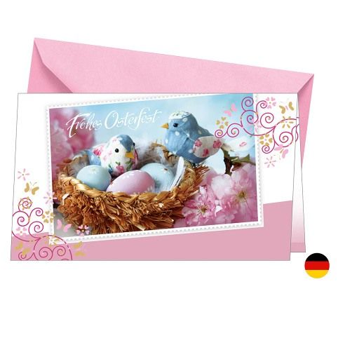 Velikonoční přání německé s textem. Jeho součástí je barevně sladěna obálka. Originální technologie zpracování od společnosti ARGUS - "Na detailu záleží!"
