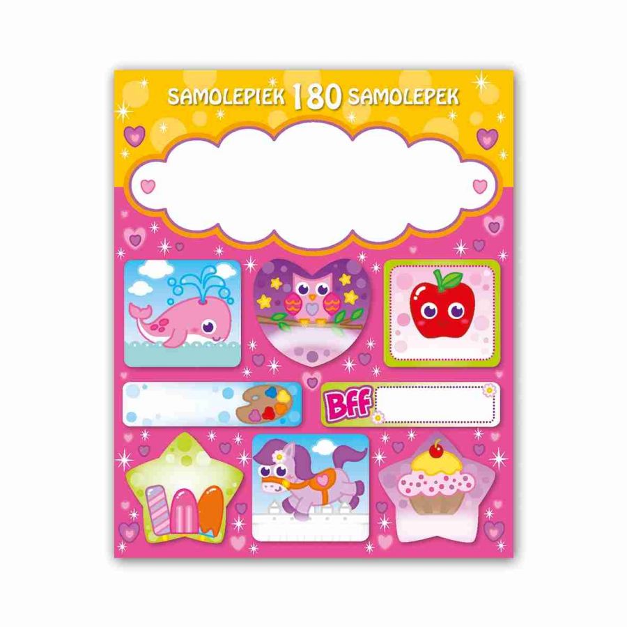 Samolepky obsahují 15 listů, 180 ks samolepek a mají prostor k dopsání jména. Samolepky si mohou děti lepit na cokoli a kamkoli – zápisníčky, obaly sešitů, do památníčků nebo na papír a vytvořit si vlastní obrázek a to hlavní, označit si věci svým jménem.