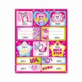Samolepky se jménem obsahují 15 listů, 180 ks samolepek. Samolepky si mohou děti lepit na cokoli a kamkoli – zápisníčky, obaly sešitů, do památníčků nebo na papír a vytvořit si vlastní obrázek a to hlavní, označit si věci svým jménem.