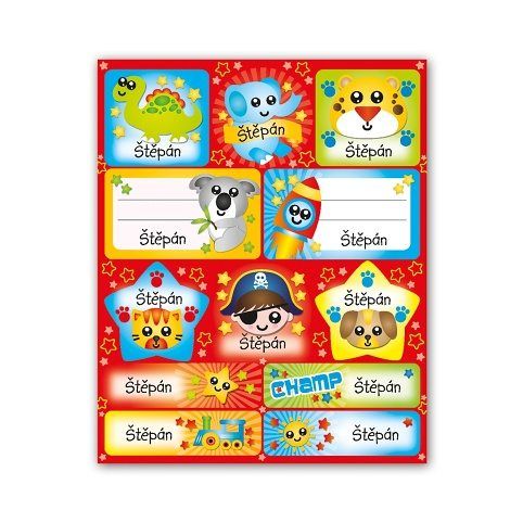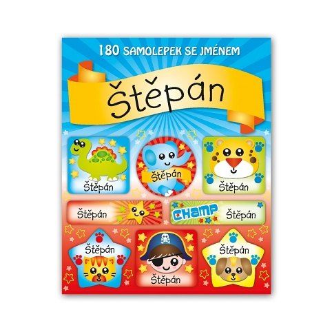 Samolepky se jménem obsahují 15 listů, 180 ks samolepek. Samolepky si mohou děti lepit na cokoli a kamkoli – zápisníčky, obaly sešitů, do památníčků nebo na papír a vytvořit si vlastní obrázek a to hlavní, označit si věci svým jménem.