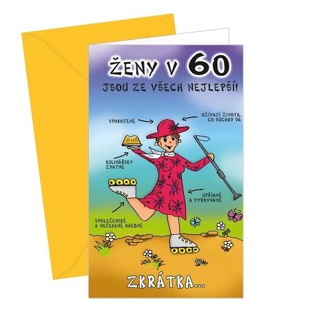 Vtipné přání k 60. narozeninám s textem uvnitř. Součástí blahopřání je barevně sladěna obálka. Originální technologie zpracování přáníčka od společnosti ARGUS - "Na detailu záleží!"