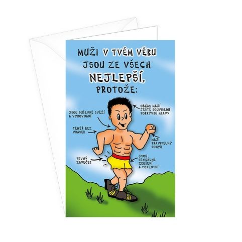 Vtipné přání k narozeninám pro muže s textem. Součástí blahopřání je barevně sladěna obálka. Originální technologie zpracování přáníčka od společnosti ARGUS - "Na detailu záleží!"