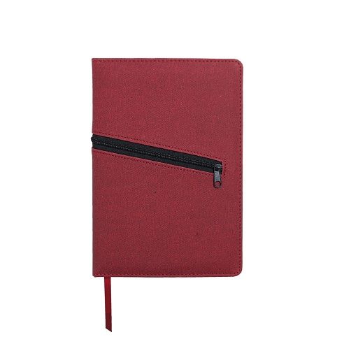 Moderní zápisník A5 s linka obsahuje 96 listů. Obal zápisníka je z kvalitní pevné látky. Výjimečná je kapsa na zadní straně zápisníka uzavíratelná zipem. Kapsu můžete využít na uschování různých drobností jako například lístek na oběd, platební či stravovací karta apod. Součástí zápisníka je i látková záložka.