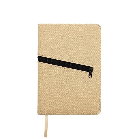 Moderní zápisník A5 s linka obsahuje 96 listů. Obal zápisníka je z kvalitní pevné látky. Výjimečná je kapsa na zadní straně zápisníka uzavíratelná zipem. Kapsu můžete využít na uschování různých drobností jako například lístek na oběd, platební či stravovací karta apod. Součástí zápisníka je i látková záložka.