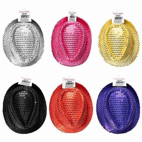 Klobouk s flitry. Barvy: modrá, stříbrná, zlatá.