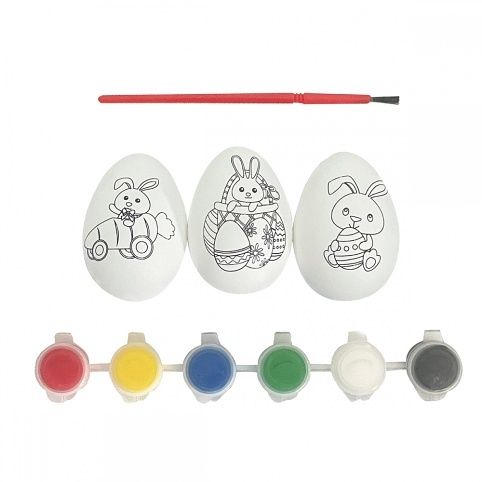 Sada 3 vajíček na malování se vzory. Součástí balení jsou barvy a štětec. Zapojující zábava při malování velikonočních vajíček. Ideální pro hraní doma, ve škole nebo školce. Rozměry kraslice: 4 x 6 cm.
