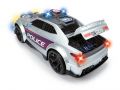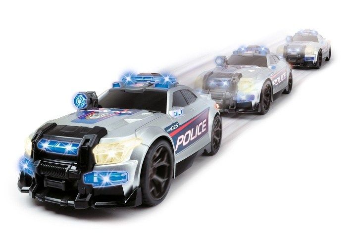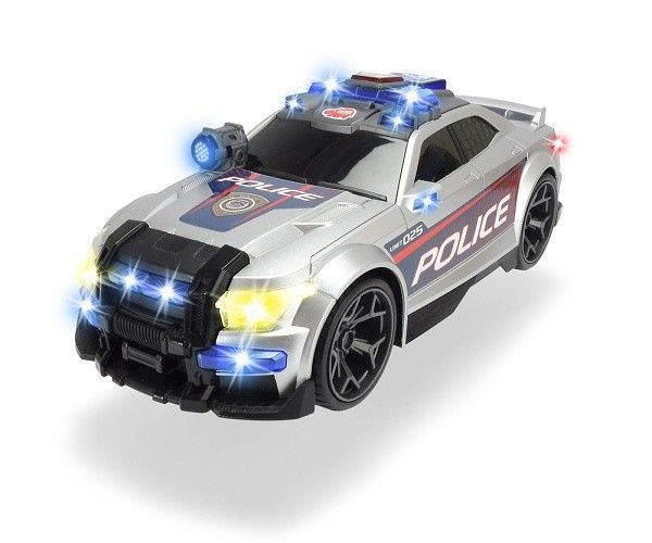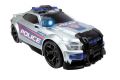 Policejní stříbrné auto se světelnými a zvukovými efekty, motorizovaný pohyb vpřed, otevírací a pohyblivé části. Délka 33 cm.