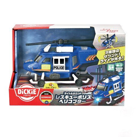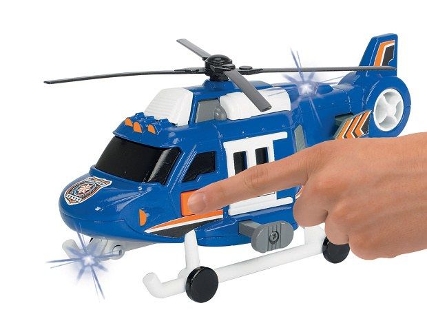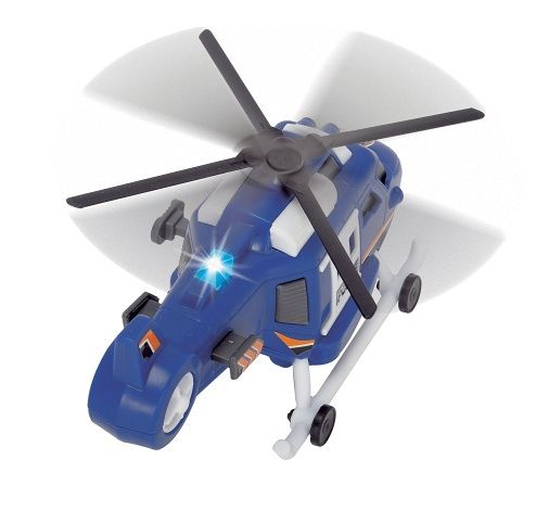 Policejní vrtulník se zvukovým a světelným efektem, na volnoběh. Manuálně ovládaný naviják, pohyblivý rotor. Délka 18 cm.
