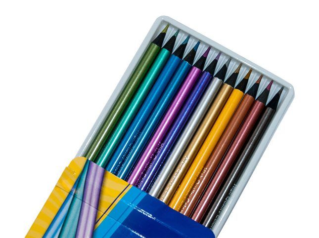 Metalické pastelky, kulaté, 12 barev, z černého dřeva, ořezávátko součástí balení.