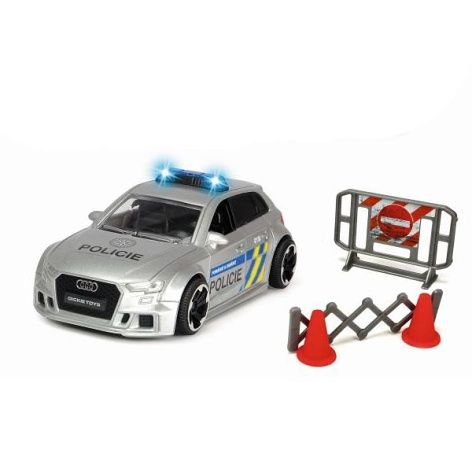 Policejní auto Audi RS3 na setrvačník, se světelnými a zvukovými efekty a otevíracími dveřmi. Příslušenství: zastavovací pás, dopravní kužely, zábrana. Velikost 15 cm, měřítko 1:32. Česká verze. Baterie jsou součástí výrobku (3x 1,5V LR44).