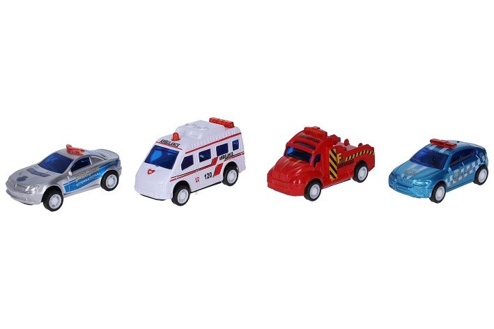 Sada autíček - akce na dálnici. Délka 7 cm. Balení obsahuje 4 ks. Pohon na zpětné natažení.