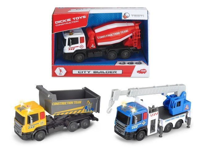 Nákladní auto Scania City Builder, 3 druhy - sklápěčka, míchačka nebo jeřáb. Kovová kabina, volnoběh, světlo, zvuk, pohyblivé díly, velikost 17 cm. Včetně baterií 3 x 1,5 V LR41. Vhodné pro děti od 3 let.