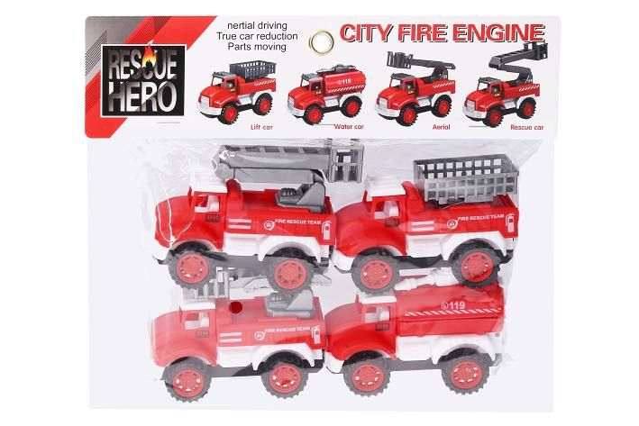 Auta hasičská 4 ks. Velikost 10,5 cm. Na setrvačník.