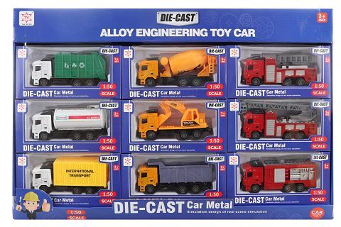 Sada různých druhů kovových aut. V balení 9 ks. Každé auto baleno v krabičce zvlášť. Rozměry krabičky cca 18x9x5 cm. Rozměry celého balení 55,5x36,5x5,5 cm. Velikost auta cca 12,5 cm. Věk 3+