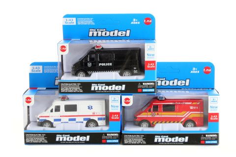 Kovové modely záchranných aut. Rozměr cca 9,5 x 4 cm. Rozměry balení cca 13,5 x 11 x 6 cm. Autíčka jsou na volný chod. Věk 3+