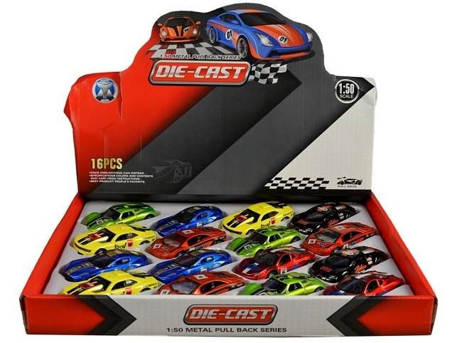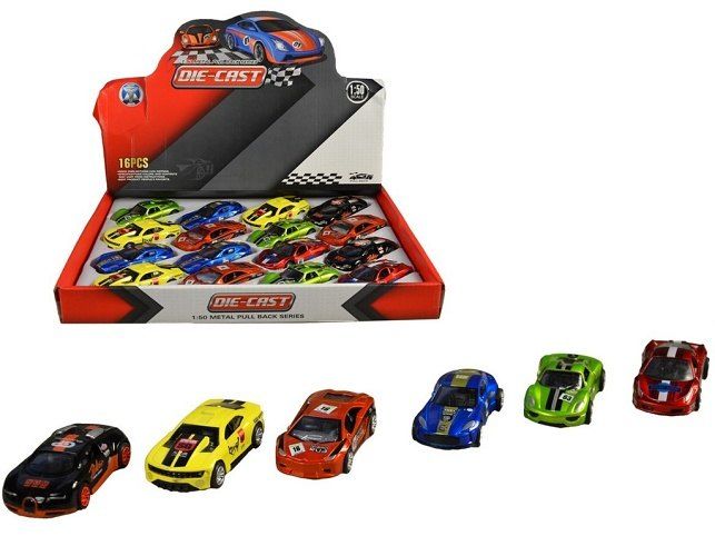 Autíčko kovové, 16 ks v display boxu. Autíček není nikdy dost. Je potřeba neustále obměňovat svůj vozový park. Balení nabízí hned 6 druhů/barev (žlutá, tmavě červená, černá, světle červená, modrá, zelená). Materiál: kov. Rozměr: 8 x 3 x 2 cm. Vhodné pro 3+.