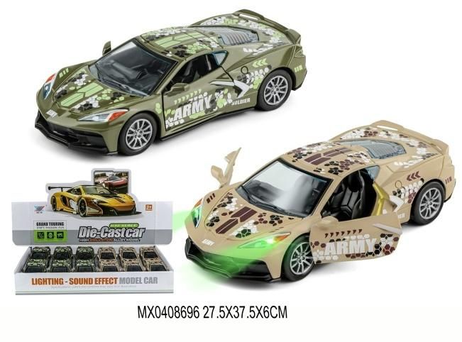 Kovový model auta ve 2 designech, kterému lze otevírat dveře. Funkce pull back – natáhni a jeď. Světelný efekt. Na baterie: 3x LR41 (jsou součástí balení)