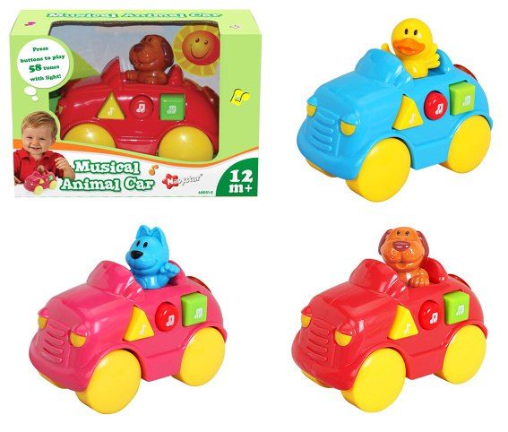 Toto hudební autíčko vaše dítě určitě zabaví. Hračka je vyrobena z kvalitního plastu. Má zářivé barvy. V nabídce je ve3 různých provedeních. Autíčko s medvídkem, autíčko s kachničkounebo autíčko s pejskem. Po stisku bočního tlačítka hraje 58 melodií.Zadní tlačítko během hraní hudby i svítí. Hrou si vaše dítěprocvičí vnímat zvuky, barvy a pomůže mu to naučit se používat funkcistisku tlačítka. Kvalitní a bezpečný plast. 58 zvuků a melodií. Na baterie: 3x LR44 (jsou součástí balení)