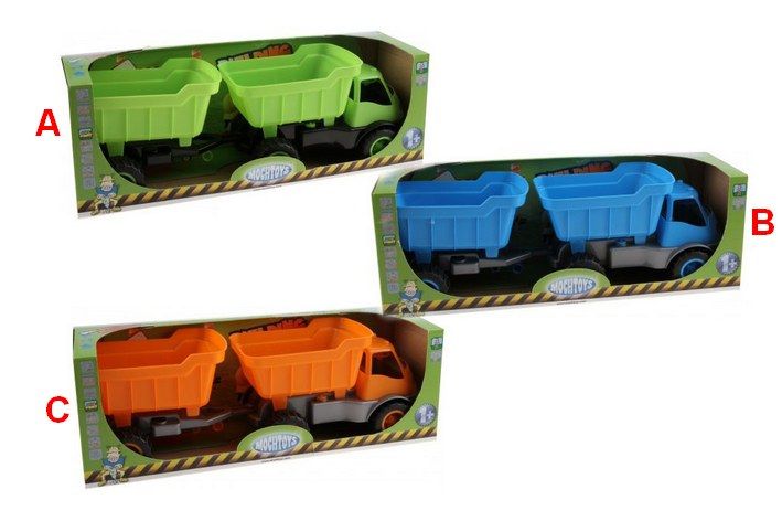 Plastový náklaďák se sklápěčkou na gumových kolech.Vhodné na hraní doma i venku.Obě korby lze sklápět - návěs lze odpojit - měkká gumová kola.
