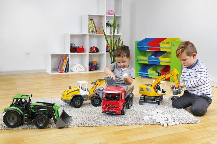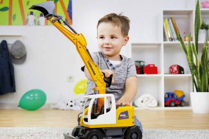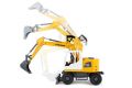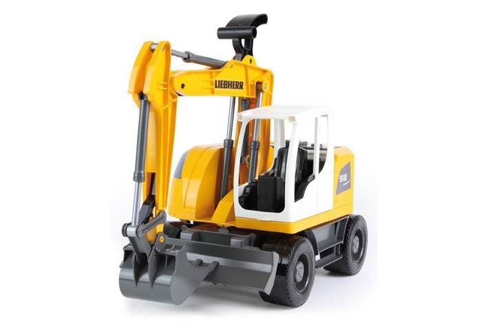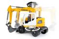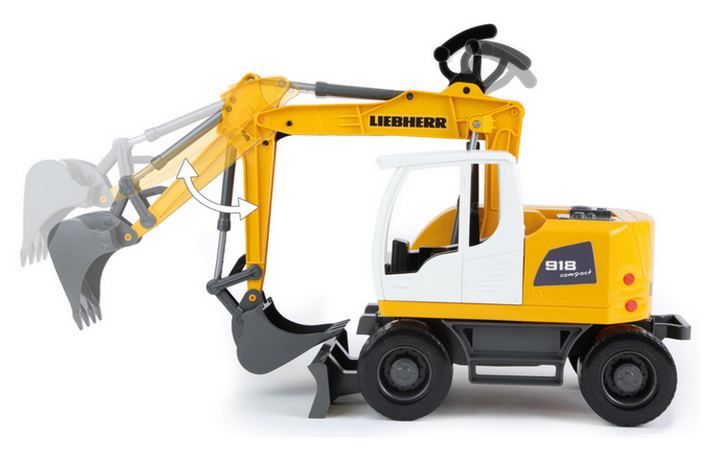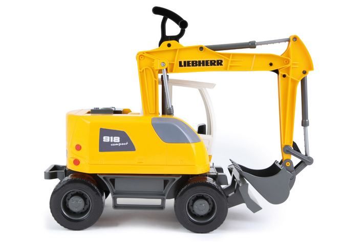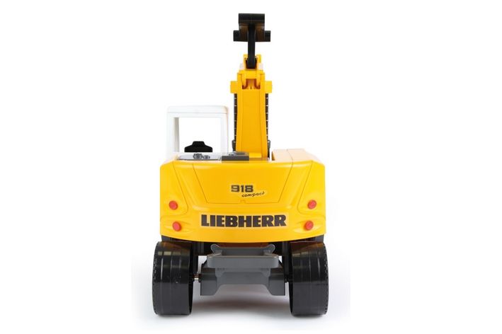 Bagr Liebherr A 918 Litronic. 6mm tlusté kovové osky u kol. Horní otočná část o 360° s možností aretace. Rameno bagru lze natáhnout 55cm. Pohyblivá přítlačná radlice.