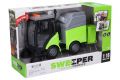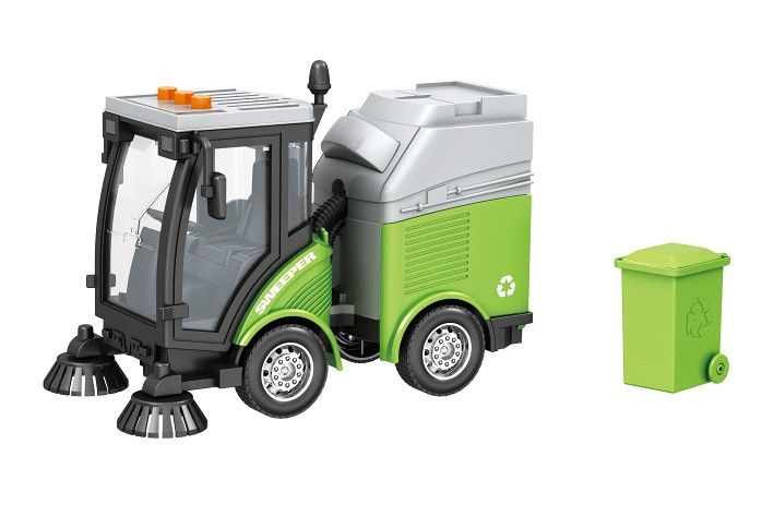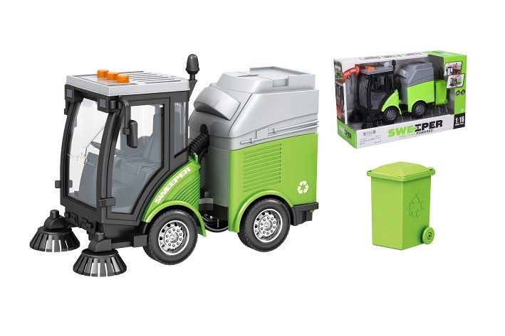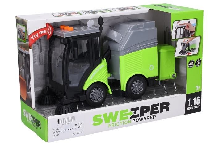 Auto čistící s popelnicí a efekty. Velikost 24 cm. Na setrvačník. Světelné a zvukové efekty tlačítky na kabině auta (startování, troubení, couvání). 3xAG13 baterie součástí.